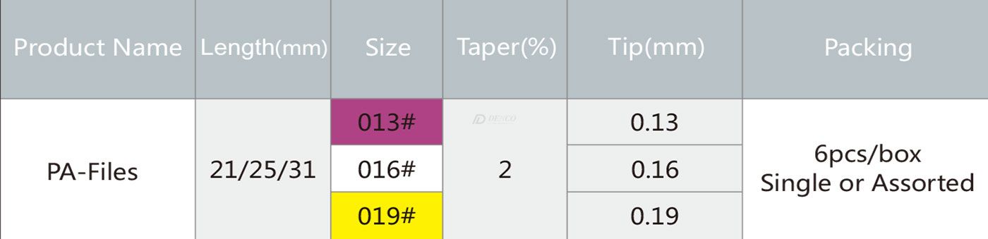 PA-FILES یکی از محصولات سیستم فایل‌های نیکل–تیتانیوم (NiTi) شرکت Shenzhen Denco Medical است که برای بازکردن و آماده‌سازی ابتدایی مسیر کانال ریشه طراحی شده. این فایل‌ها مخصوص ایجاد دسترسی سریع و ایمن به طول کاری کانال هستند و در مراحل اولیه درمان ریشه (اندودانتیکس) مورد استفاده قرار می‌گیرند.